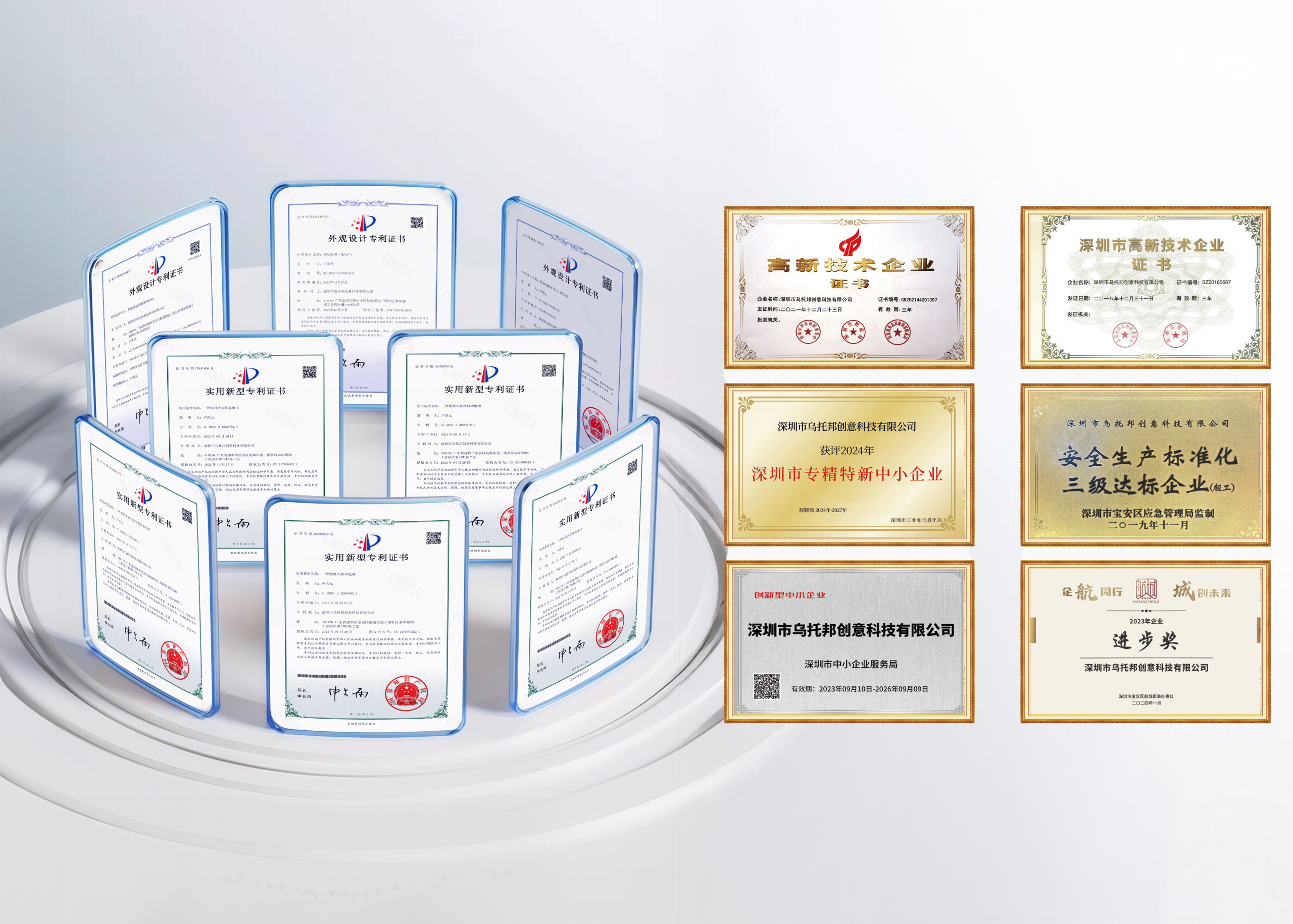 实力铸就口碑,专业赢得信赖。乌托邦始终坚持高标准合规化运营,已通过ISO9001质量管理体系、BSCI商业社会标准认证及SEDEX 8000认证。产品拥有CE、RoHS、UN38.3、FCC、等全套国际资质,并屡获“国家高新技术企业”、“深圳市专精特新中小企业”等殊荣。